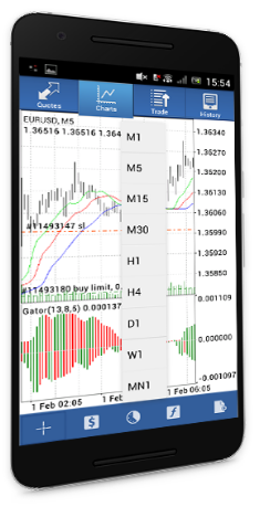 Interactive charts track instrument rate changes in real time. The app provides three types of charts allowing you to trade directly on them. You can easily scale and scroll charts, as well as switch between nine timeframes — from one minute to one month.